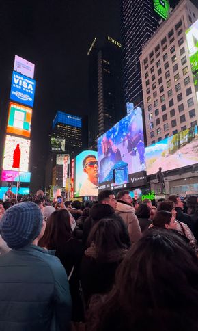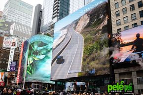 Shakira đang diễn trên sân khấu ngay bên dưới cái hình trên màn hình khổng lồ ở Times Square