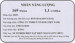 Cục đăng kiểm Việt Nam vừa đăng tải công khai mức tiêu thụ của mẫu xe BYD Sealion 6, một mẫu xe chưa ra mắt chính thức tại thị trường Việt Nam. BYD Sealion 6 là mẫu SUV sử dụng hệ truyền động Plug-In Hybrid, trong đó bao gồm 1 động cơ xăng dung tích 1.5L kết hợp với 1 động cơ điện kèm bộ pin có thể cắm sạc. Theo nhãn năng lượng của cục đăng kiểm, mẫu xe này có mức tiêu thụ nhiên liệu kết hợp là 1,1L / 100km.