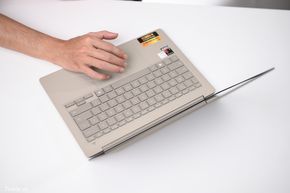 Nhờ đó, chúng ta sẽ có một bề mặt máy rất đặc biệt. Mình là người đổ rất nhiều mồ hôi tay và cũng sử dụng nó trong khá nhiều môi trường có thể nói là không được giữ gìn. Vậy mà khi cầm chiếc máy này lên để quay, gần như không cần phải lau chùi hay vệ sinh gì cả. Rõ ràng, mọi người có thể thấy bề mặt ASUS Zenbook A14 hơi nhám một chút xíu và nó được xử lý một lớp cực kỳ đặc biệt để gần như không thể thấy được những vết bám vân tay hay vết bẩn.