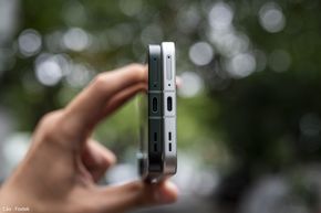 Cạnh đáy của thiết bị có khay SIM, mic thu âm, cổng sạc USB-C, loa ngoài và hai dải anten.