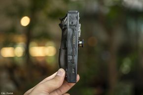 Cạnh trái và cạnh phải của máy đều có chân kết nối với phụ kiện tay cầm.