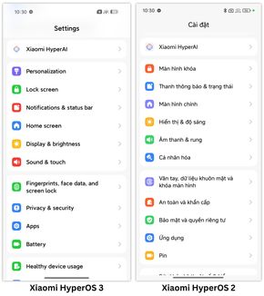 Mục Cá nhân hóa trong cài đặt hệ thống của Xiaomi HyperOS 3 (bên trái) gần tương đồng HyperOS 2 (bên phải).