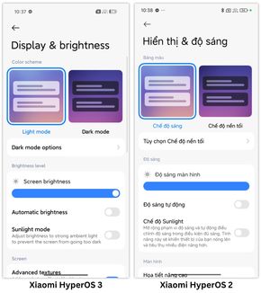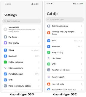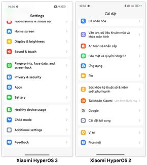 Giao diện cài đặt hệ thống của Xiaomi HyperOS 3 (bên trái) cũng không có nhiều khác biệt so với HyperOS 2 (bên phải).