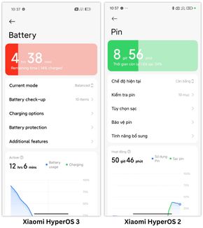 Phần cài đặt hiển thị icon pin của Xiaomi HyperOS 3 (bên trái) có chút khác biệt so với HyperOS 2 (bên phải).