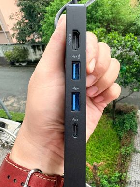 Điểm không hài lòng ở Hub này là cọng dây USB-C đi theo, tuy rằng gắn bên hông Dock này gọn, nhưng khi dùng cắm cho máy thì hơi khó chịu và chiếm diện tích, dây khá cứng, Dock đã nằm ngang, kết nối lại nằm dài ra thêm khúc nữa, mình không sử dụng dây của nó mà dùng dây Thunderbolt 3 của Apple luôn để tiện sắp xếp và linh động cắm