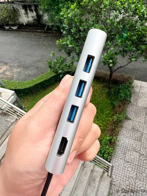 Như đã nói ở trên, HD449 sinh ra chắc chắn là dành cho iPad, bản thân trong phụ kiện kèm theo của HD449 có thêm dây USB-C dài để tiện dùng cho Macbook, lưu ý nếu bạn nào dùng Macbook khi cắm nó mà không dùng dây rời thì lúc gập màn xuống quên tháo hub là có thể ảnh hưởng tới màn hình.HD449 có thông số cổng như sau: