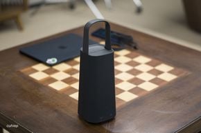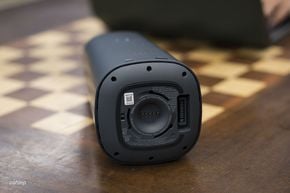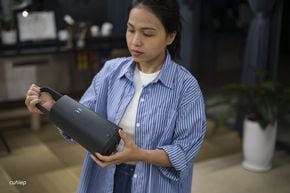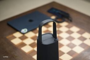 Nhìn cục OC Portable Battery giống như một cái túi xách có cái quai rất nhẹ nhàng và điệu đà. Hình dáng cao, thanh mảnh tạo ra cảm giác gọn gàng, khác biệt rất lớn so với hầu hết các sản phẩm pin dung lượng cao hay trạm sạc nhiều pin trên thị trường. Chúng ta nhìn nó giống như một sản phẩm loa cao cấp hơn là pin di động.