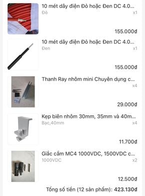 - Vật tư lắp đặt: Bao gồm jack MC4, dây DC chuyên dụng, jack XT60, CB bảo vệ, thanh ray nhôm, kẹp biên cố định, v.v., tổng cộng khoảng 500.000đ