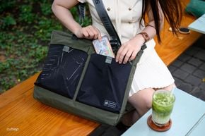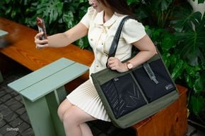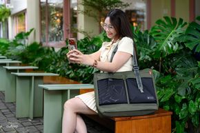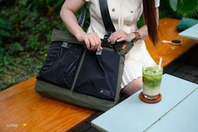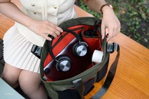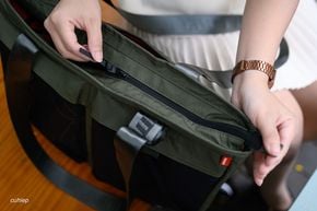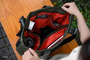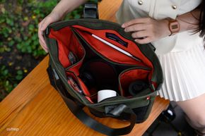 Mình thích cách phân chia theo chiều dọc trong không gian bên trong của túi với hai ngăn lớn ở hai góc túi, các ngăn nhỏ xung quanh và tạo ra một không gian lớn ở giữa. Mình sẽ để máy ảnh ở một ngăn lớn, ngắn lớn còn lại để túi phụ kiện, điện thoại ở các ngăn xung quanh và ở giữa là để đồ chung.