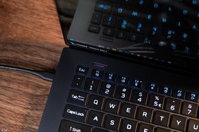 Và điểm nhấn nằm ở hai chỗ. Thứ nhất là nút đổi profile vận hành. Cái này chắc sẽ có người nhầm lẫn với nút nguồn vì có dải đèn LED RGB, nhìn hơi giống cảm biến vân tay. Nhưng thật ra nó vừa có cơ chế chuyển profile vận hành, thay đổi TDP và xung nhịp của CPU lẫn GPU, hay thay đổi được cả công suất tối đa của hệ thống quạt tản nhiệt của chiếc máy. Còn nút nguồn thì ở góc trên bên phải bàn phím.