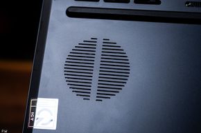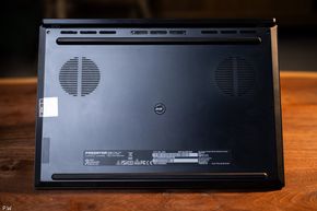 Và khi nói đến hệ thống tản nhiệt, thì sẽ phải nhìn xuống dưới đáy của chiếc máy. Chỉ có hai lỗ hổng hút gió ở mặt đáy, thay vì cả hệ thống lưới hút dễ hút theo cả bụi trong không khí. Ở chỗ đó là hai chiếc quạt tản nhiệt siêu mỏng, AeroBlade 3D thế hệ 6, mỗi chiếc 100 cánh quạt kim loại siêu mỏng, phản ứng nhanh, có thể nâng lên và thích ứng ở tốc độ cao, tăng hiệu quả luồng gió lên đến 20% so với thế hệ thứ 5. Độ dày của những cánh quạt chỉ là 0.05mm, hút khí tươi từ mặt đáy của máy tính, thổi qua hệ thống heatsink với buồng hơi và đẩy khí nóng ra khe ở cạnh trước.
