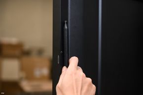 Vậy thì viết lên bảng như thế nào? Hai bên cạnh màn hình sẽ là hai cây bút. Chúng cũng chẳng phải bút thông minh hay có linh kiện bên trong đâu. Thứ thông minh chính là tấm nền 75 inch 4K của WAF cơ. Nó đủ khả năng nhận diện được tiết diện cảm ứng, chạm nhỏ là viết, chạm lớn là xóa. Thành ra bên cạnh cây bút, các thầy cô hoàn toàn có thể viết bằng ngón tay.