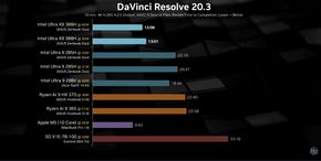 Điểm nhấn thực sự nằm ở GPU tích hợp Arc B390, khi nó không chỉ đánh bại hoàn toàn các iGPU của AMD (Radeon 890M) mà còn bắt đầu gây áp lực lên các giải pháp đồ họa rời tầm trung của vài năm trước. Dù vậy, trong các bài kiểm tra chuyên sâu như DaVinci Resolve, chip Apple M5 vẫn duy trì vị thế dẫn đầu với hiệu năng cao hơn khoảng 49% so với giải pháp tích hợp của Intel.