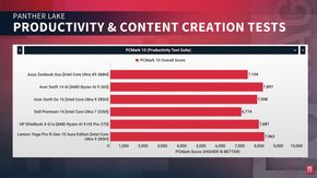 Tiếp tục là mẫu đánh giá Core Ultra X9 388H, về hiệu năng tính toán thuần túy, các bài kiểm tra như PCMark 10, Cinebench và Geekbench cho thấy Panther Lake không tạo ra sự bứt phá quá lớn so với các đối thủ cùng phân khúc cao cấp hiện nay, mà chủ yếu duy trì vị thế ở mức ổn định. Tuy nhiên, trong ứng dụng thực tế như Photoshop (thông qua PugetBench), chip Intel mới cho thấy thế mạnh rõ rệt và là một trong những hệ thống nhanh nhất từng được thử nghiệm, hứa hẹn là lựa chọn lý tưởng cho những người sáng tạo nội dung chuyên nghiệp.