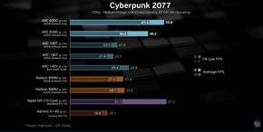- Cyberpunk 2077 (1080p, Medium, không upscaling): Đạt trung bình 64 FPS. Con số này vượt xa mức 41 FPS của AMD Radeon 890M (kiến trúc Strix Point) và gần gấp đôi mức 33 FPS của iGPU Arc thế hệ cũ.