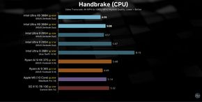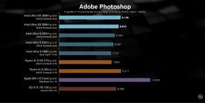 Trong Geekbench và Cinebench, Ultra 9 388H nằm giữa các chip Arrow Lake H năm ngoái và vượt qua Ryzen 9 (Omnibook) cũng như Snapdragon X Elite (Slim 7X), tuy nhiên, nó vẫn xếp sau M4 Pro của Apple về hiệu năng đơn nhân và đa nhân.