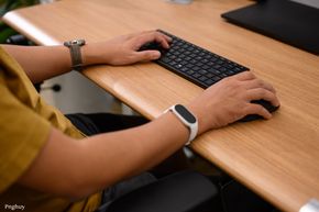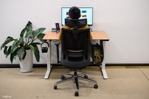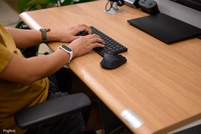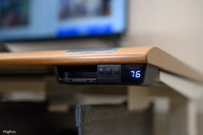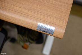 Một điểm mình thích ở chiếc bàn này là cạnh bàn được bo tròn theo dạng "sloped edge", ôm theo đường tay người dùng, giúp cổ tay và cẳng tay không bị cấn khi gõ phím, viết hay tì người vào mép bàn khi đứng. Hoàn thiện bề mặt của bàn cũng là dạng vân gỗ, được làm bóng và có độ bám tốt, chống bám vân tay.
