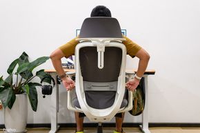 Điểm quan trọng nhất trong thiết kế Portone Plus là khung lưng linh hoạt, có khả năng uốn nhẹ theo chuyển động cơ thể thay vì cố định cứng, giúp những chuyển động xoay người, nghiêng sang trái/phải khi với đồ trên bàn trở nên tự nhiên và đỡ bị "gò". Phần đỡ thắt lưng được thiết kế dạng đệm mềm, có thể trượt lên/xuống để tùy chỉnh vị trí, nhằm bám đúng vùng lõm thắt lưng của từng người, giúp giữ cột sống ở trạng thái trung lập, giảm mỏi lưng khi ngồi lâu.