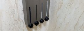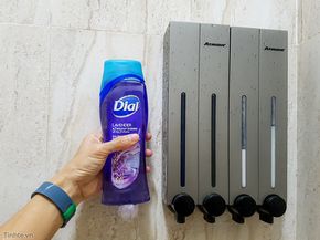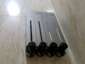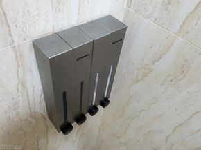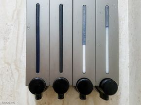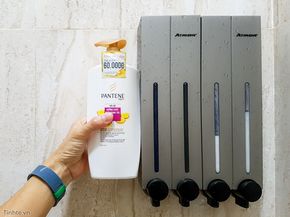 Việc gắn những bình này lên tường phòng tắm cũng đơn giản. Anh em chỉ cần khoan 4 lỗ cho mỗi cặp bình và gắn bát, sau đó gá cái bình vào. Mỗi bình màu trắng được che bởi nắp ốp nhôm rất sạch sẽ, dễ vệ sinh. Nắp có khe để có thể thấy được lượng xà bông còn lại trong bình.