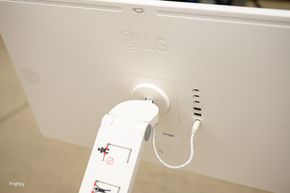 Một điểm cộng cực lớn cho công việc là khả năng kết nối. Anh em chỉ cần đặt laptop lên cái mâm ở dưới chân đế hoặc để trên bàn, cắm một sợi cáp USB-C duy nhất nối lên màn hình là xong. Cáp này vừa xuất hình 4K, vừa hỗ trợ Power Delivery sạc ngược luôn cho laptop. Ngoài ra phía sau màn hình cũng có sẵn 2 cổng HDMI để anh em cắm thêm PC hoặc máy chơi game.