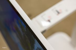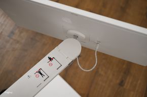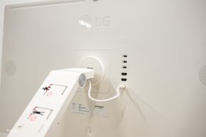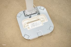 Điểm ăn tiền nhất và cũng đập vào mắt nhất của chiếc màn hình này chính là cụm chân đế. Nó to, nặng, có hệ thống bánh xe ẩn bên dưới lăn cực kỳ mượt trên sàn phẳng.