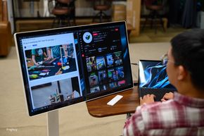 Hoặc vui hơn nữa, anh em xoay dọc màn hình lại. Lúc này chúng ta có một chiếc 'điện thoại khổng lồ' 32-inch để lướt TikTok, xem YouTube Shorts cực kỳ đã. Đối với gia đình, anh em có thể kéo nó ra phòng khách làm bảng vẽ cảm ứng cho con nít học tập, hoặc làm màn hình hướng dẫn tập Yoga cho vợ.