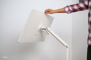 Đi kèm là một tay đỡ lò xo dạng Ergo arm khổng lồ. Anh em có thể kéo nó lên cao, hạ xuống thấp sát mặt bàn, có thể điều chỉnh độ nghiêng, xoay trái phải, thuận tiện điều khiển lúc nằm chill chill, và tất nhiên là xoay dọc 90 độ. Cảm giác xoay vặn rất chắc chắn và mượt mà.