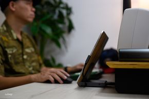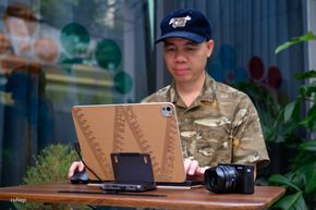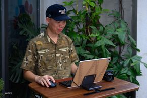 Mình set up sẵn trên bàn, chỉ cần nối iPad vào là nó thành cái máy tính.